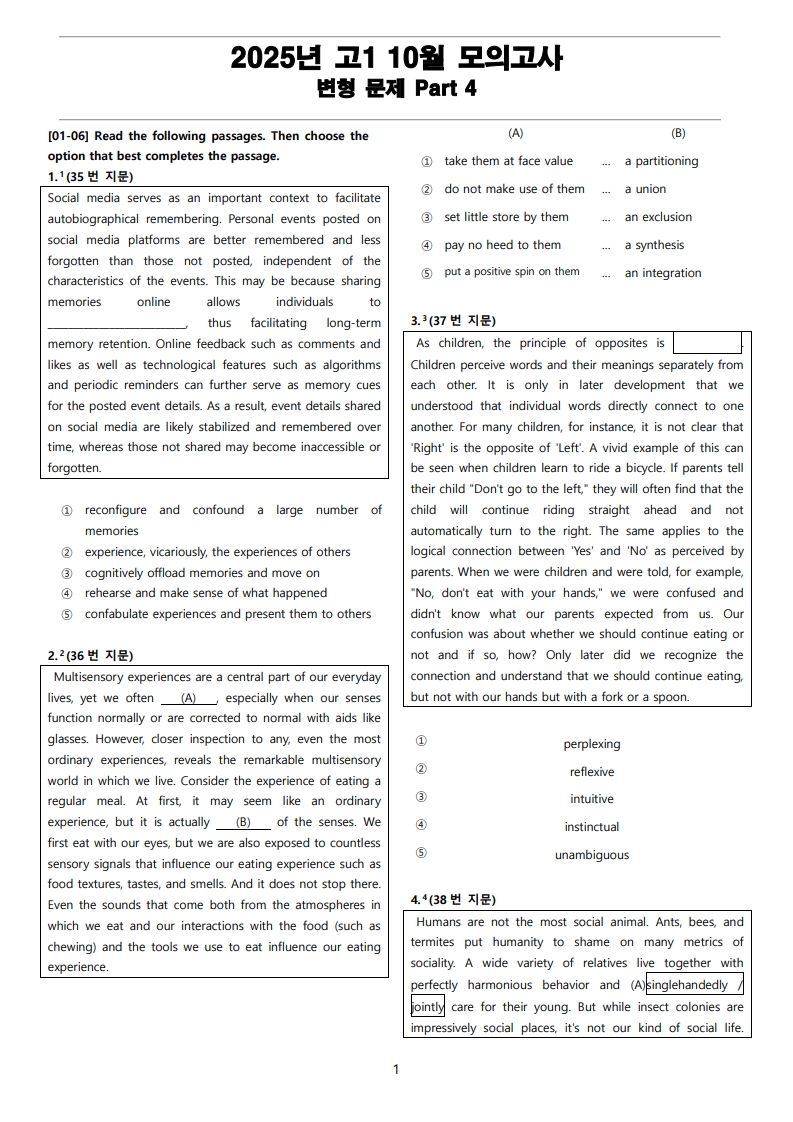 2025년 고1 10월 전국 연합 모의고사 변형 문제 Part 4를 선보입니다.