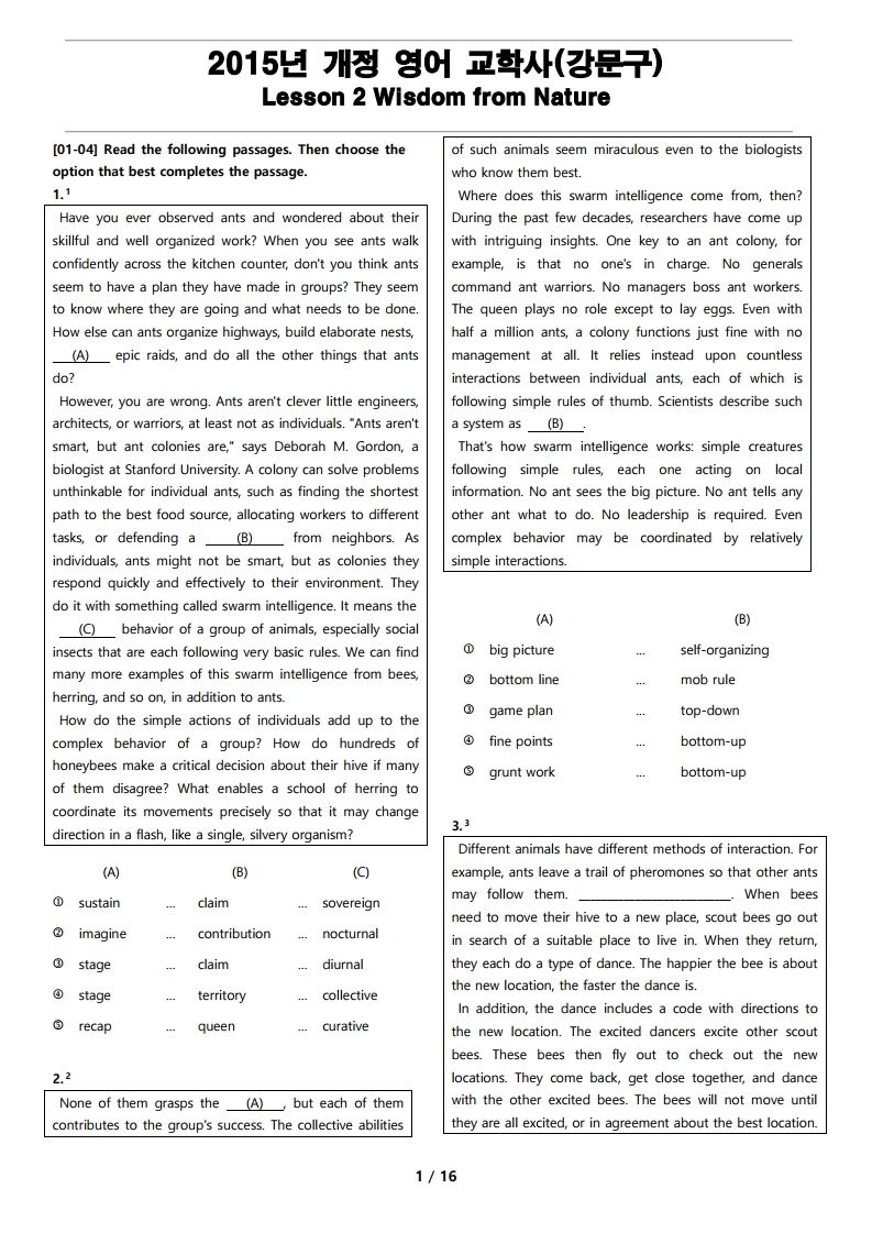 2015년 개정 영어 I 교학사(강문구) 2과 변형 문제 Wisdom from Nature