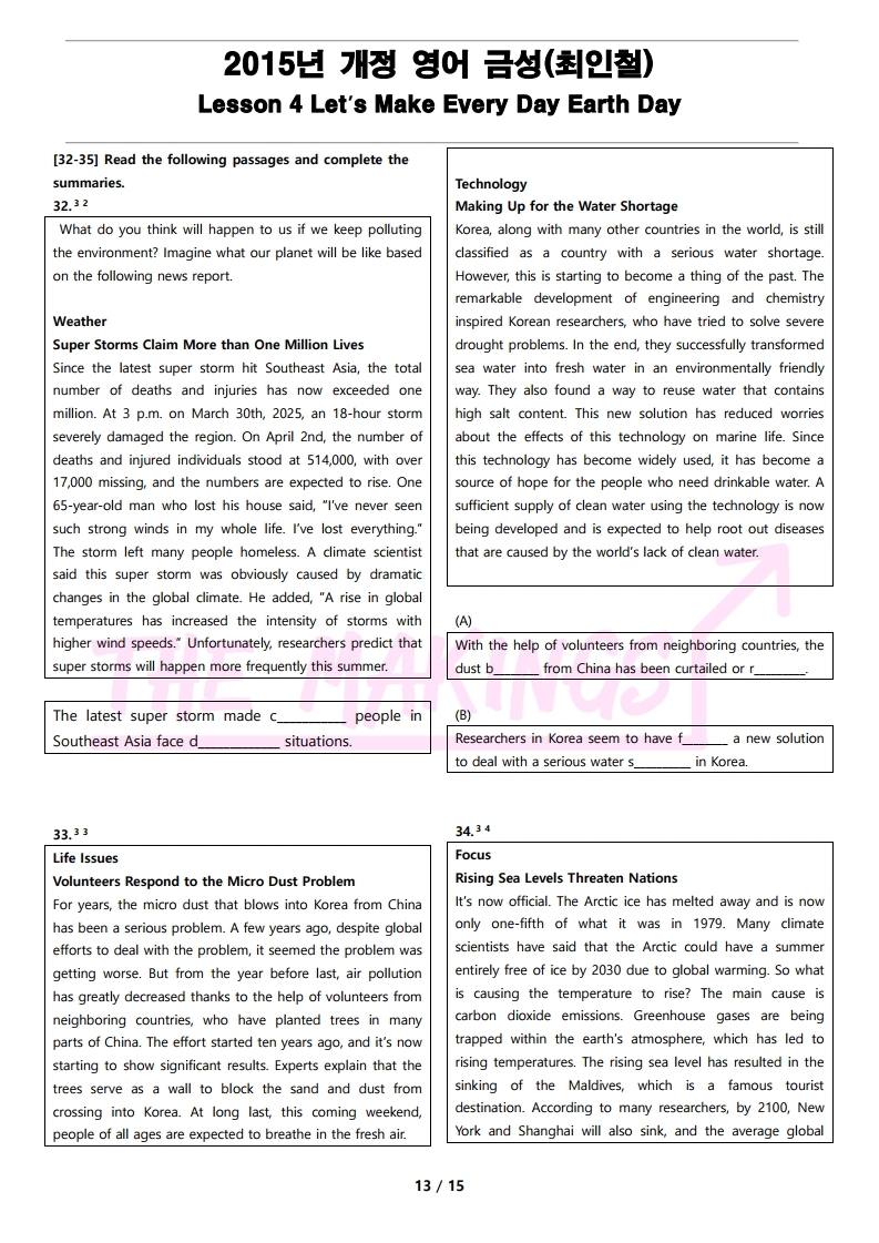 2015년 개정 영어 금성(최인철) 내신 문제, 고등교과서 내신 문제, 고등 변형문제, 고등영어자료, 금성 영어 교과서 변형 문제, 금성 최인철 내신 문제