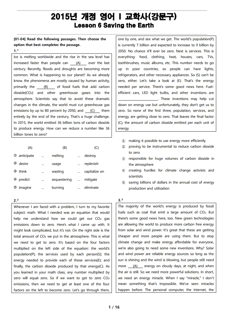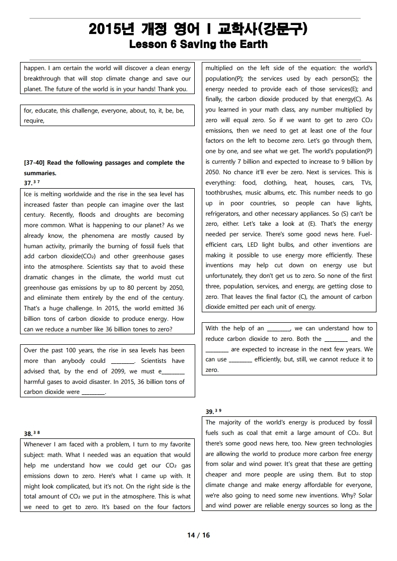 2015년 개정 영어 I 교학사(강문구) 6과 변형 문제 Saving the Earth