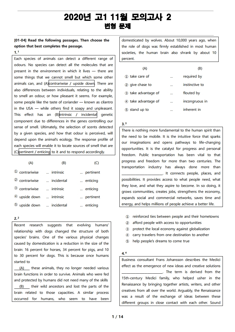 2020년 고1 11월 전국 연합 모의고사 변형 문제 2의 지문입니다.