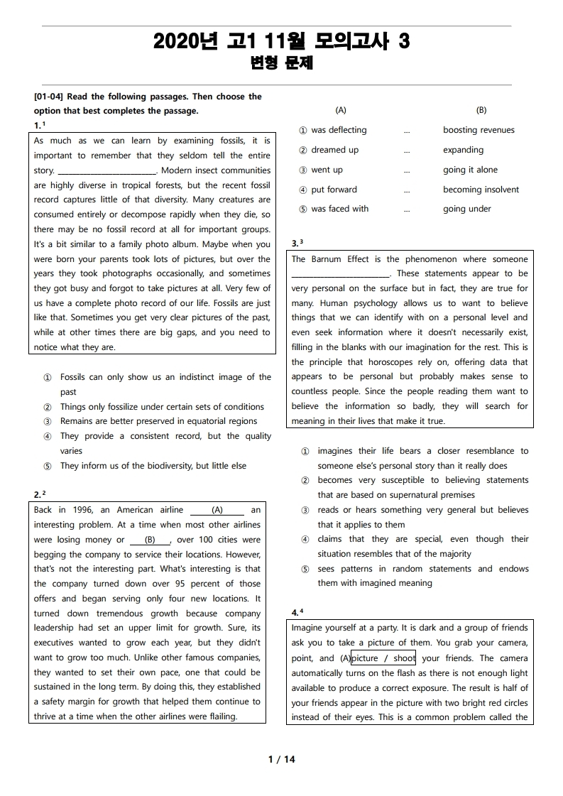 2020년 고1 11월 전국 연합 모의고사 변형 문제