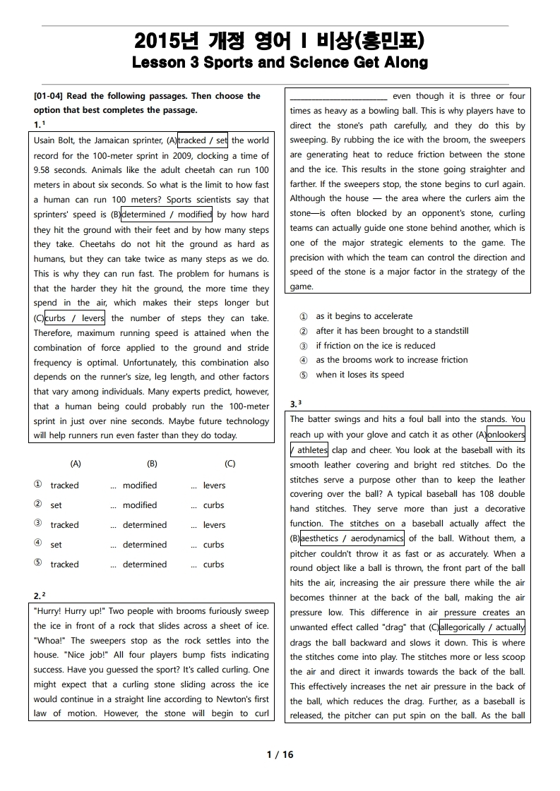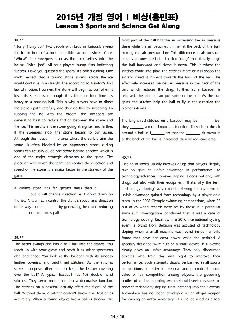 2015년 개정 영어 I 비상(홍민표) 3과 변형 문제 Sports and Science Get Along