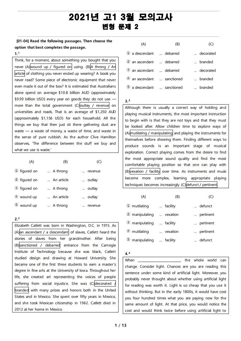2021년 고1 3월 전국 연합 모의고사 변형 문제