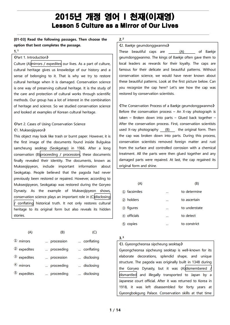 최상의 2015년 개정 영어 I 천재(이재영) 5과 변형 문제를 선보입니다.