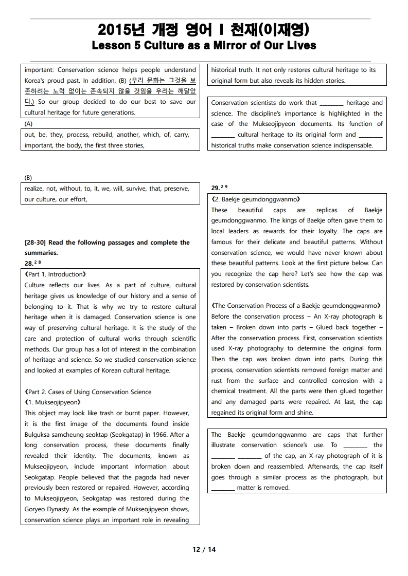 제작한 2015년 개정 영어 I 천재(이재영) 5과 변형 문제로 마무리 하세요.