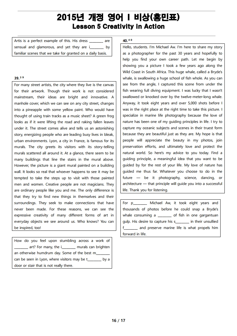 더메이킹스(The Makings)가 제작한 2015년 개정 영어 I 비상(홍민표) 5과 변형 문제의 지문입니다.
