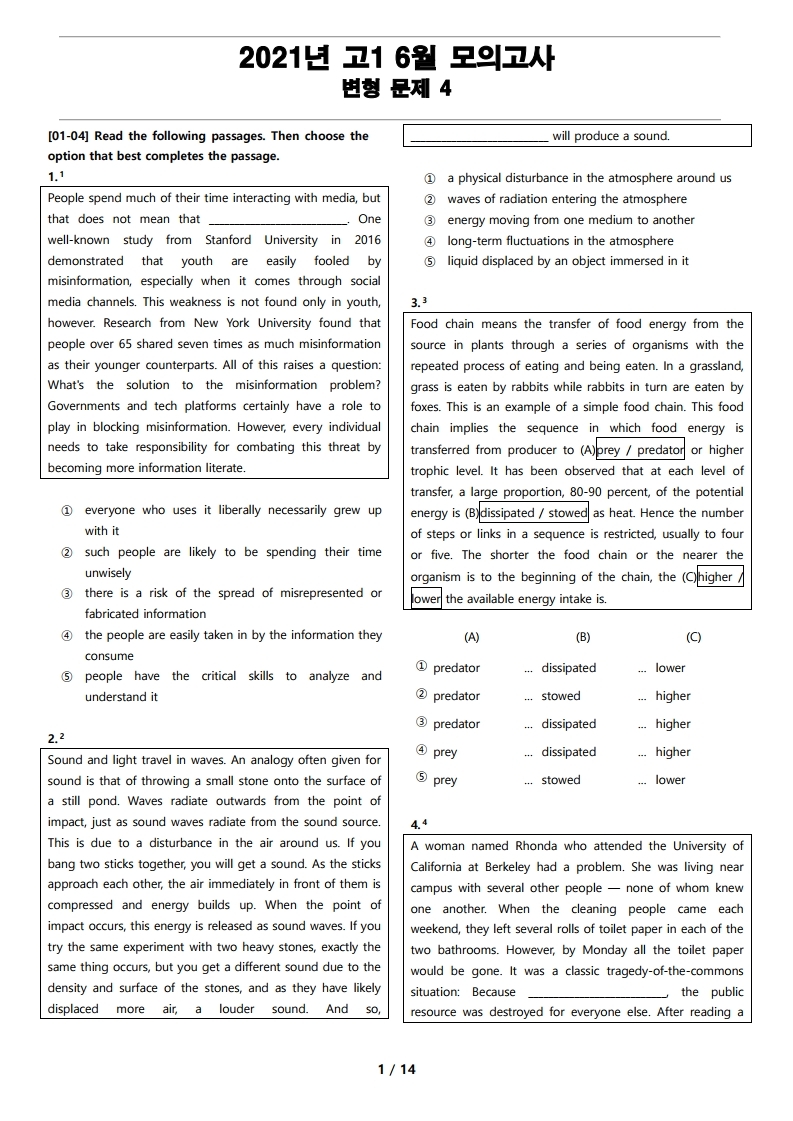 2021년 고1 6월 전국 연합 모의고사 변형 문제 4 를 선보입니다.