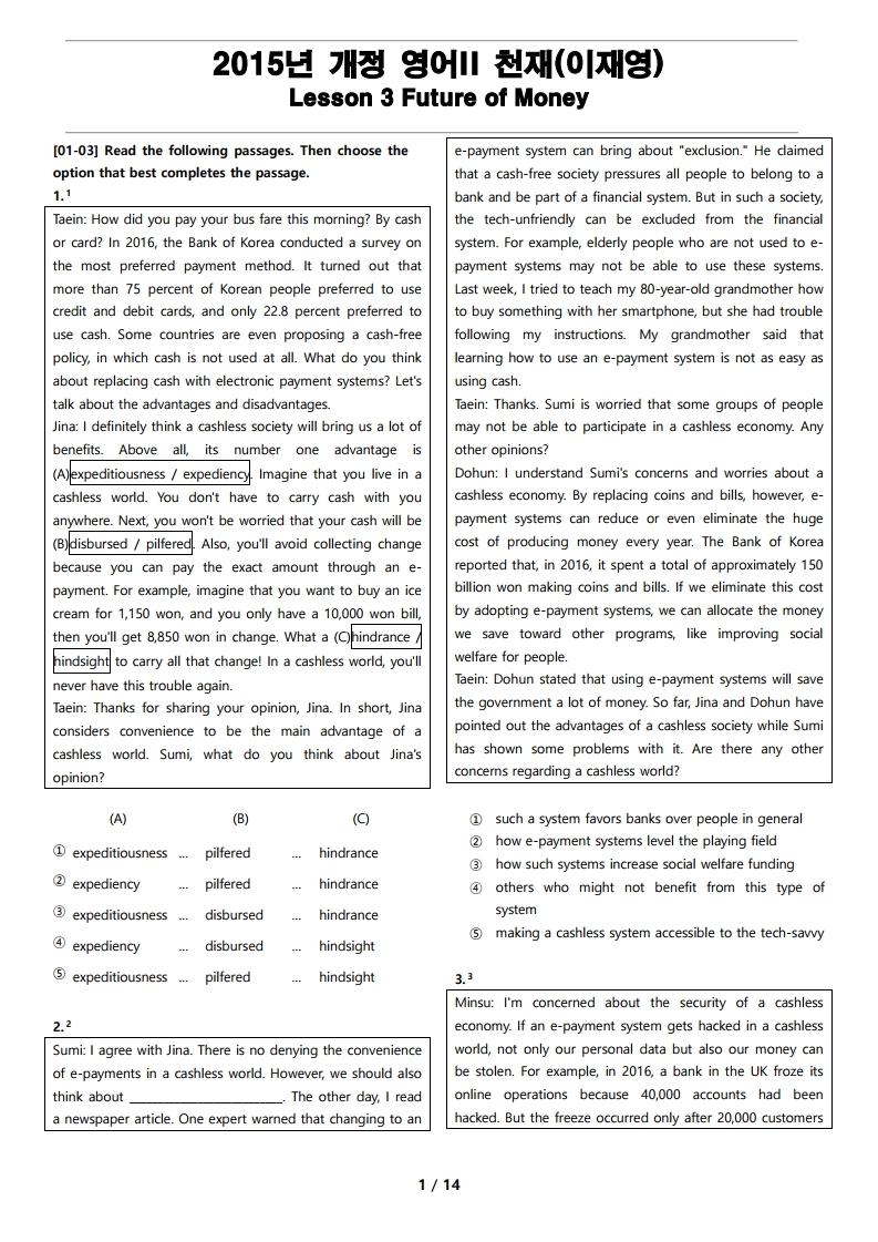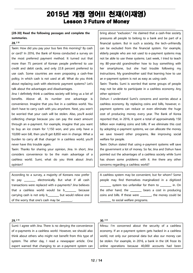 2015년 개정 영어 II 천재(이재영) 3과 변형 문제 Future of Money