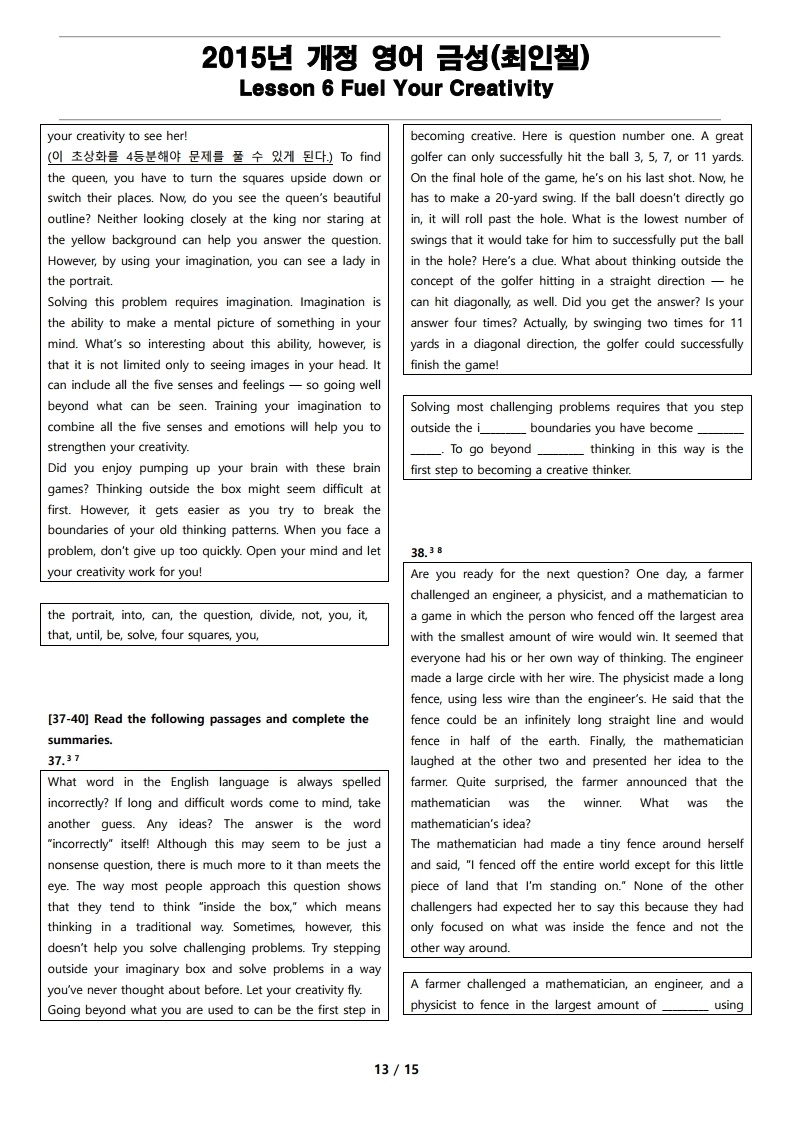 2015년 개정 영어 금성(최인철) 6과 변형 문제로 마무리하세요.