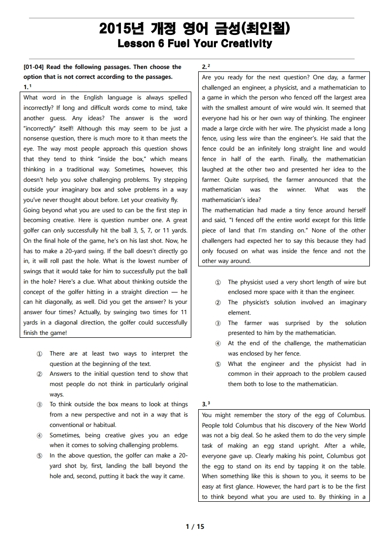 2015년 개정 영어 금성(최인철) 6과 변형 문제를 선보입니다.