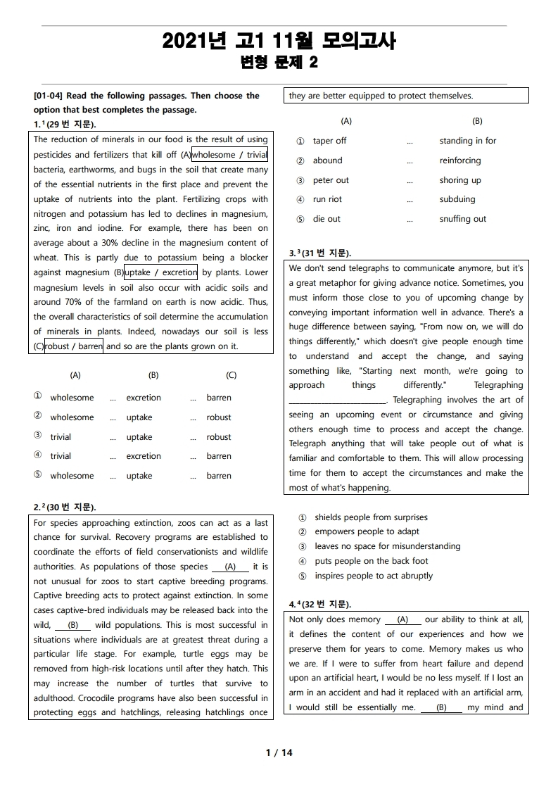 2021년 고1 11월 전국 연합 모의고사 변형 문제 2