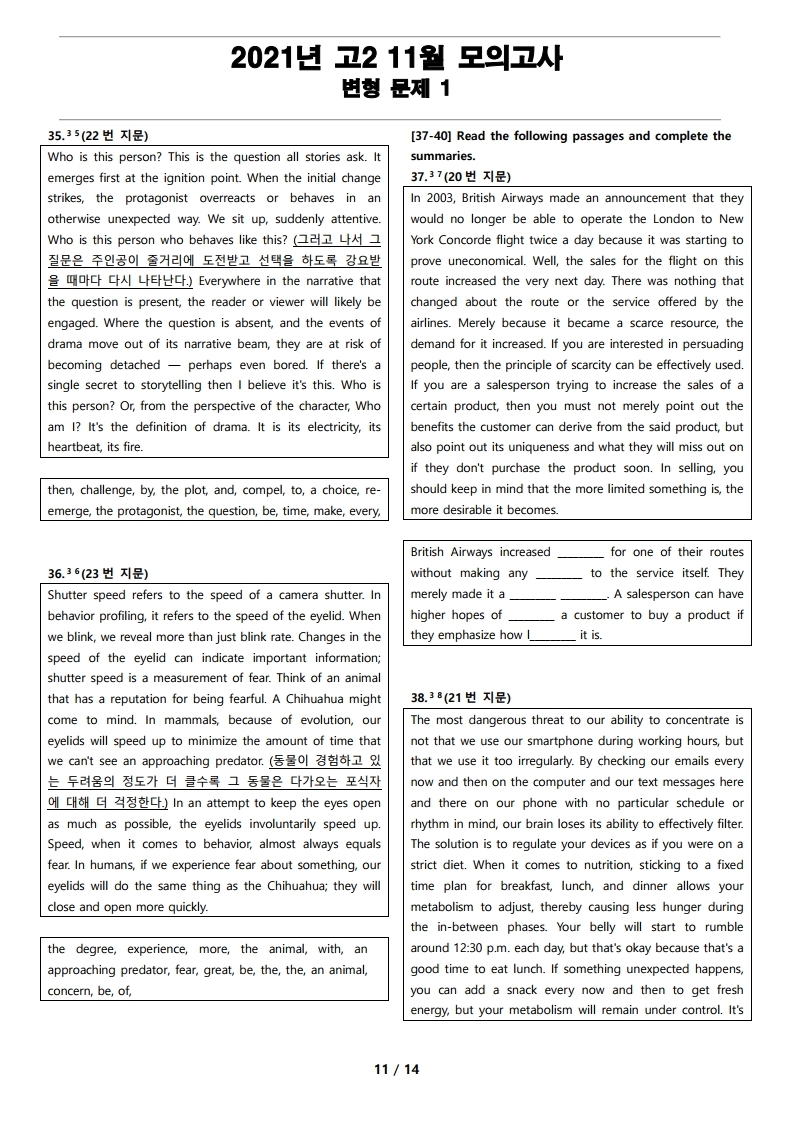 2021년 고2 11월 전국 연합 모의고사 변형 문제, 내신대비, 영어내신자료,고등영어자료, 모의고사 변형문제,전국 연합모의고사 변형자료, 모의고사 영어 서술형 대비, 대치동 고등 영어자료, 대치