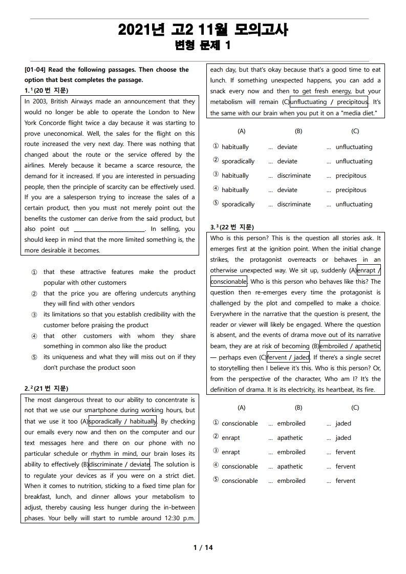 2021년 고2 11월 전국 연합 모의고사 변형 문제 1
