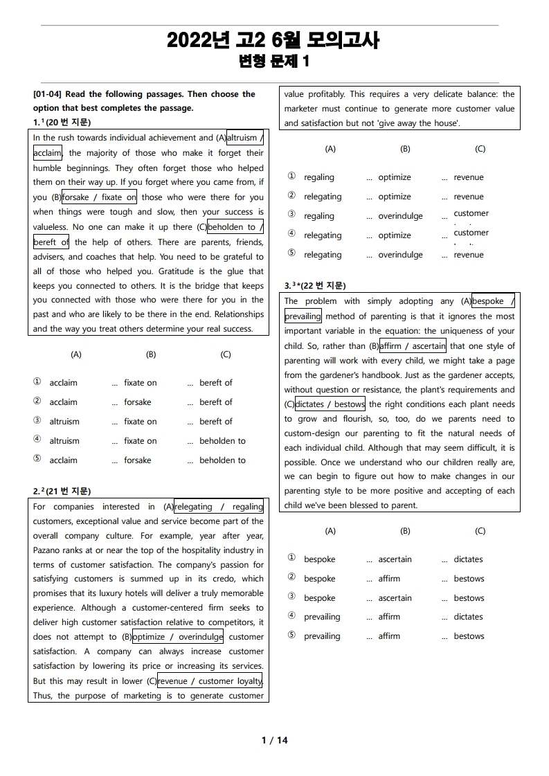 2022년 고2 6월 전국 연합 모의고사 변형 문제 1