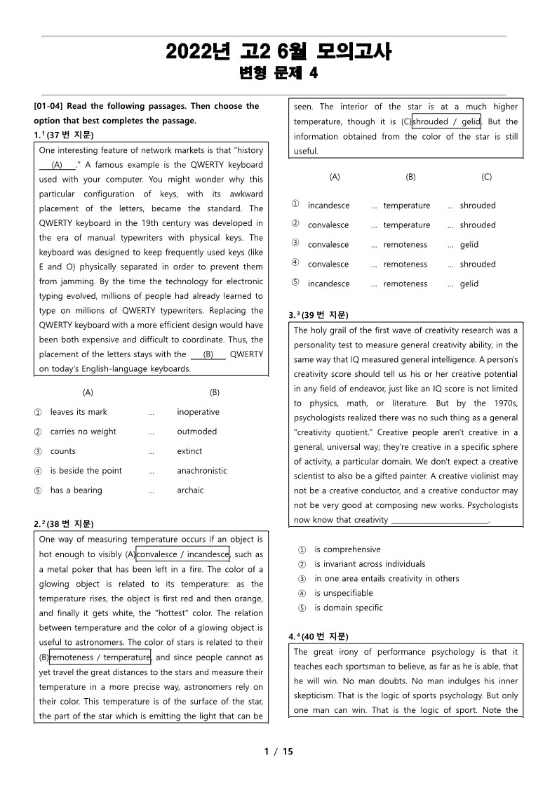 최상의 2022년 고 2 6월 전국 연합 모의고사 변형 문제 4를 선보입니다.