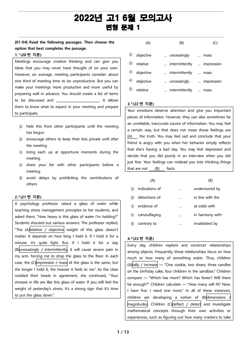 2022년 고1 6월 전국 연합 모의고사 변형 문제 1의 지문입니다.