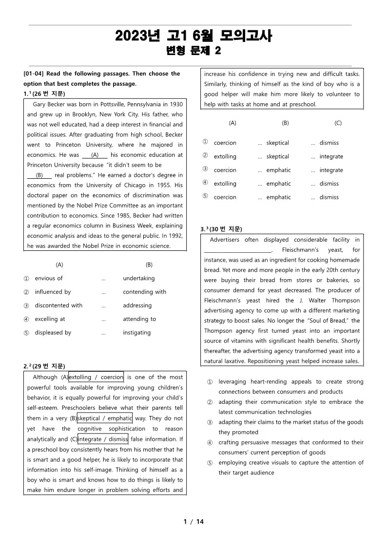 최상의 2023년 고1 6월 전국 연합 모의고사 변형 문제 2 선보입니다.