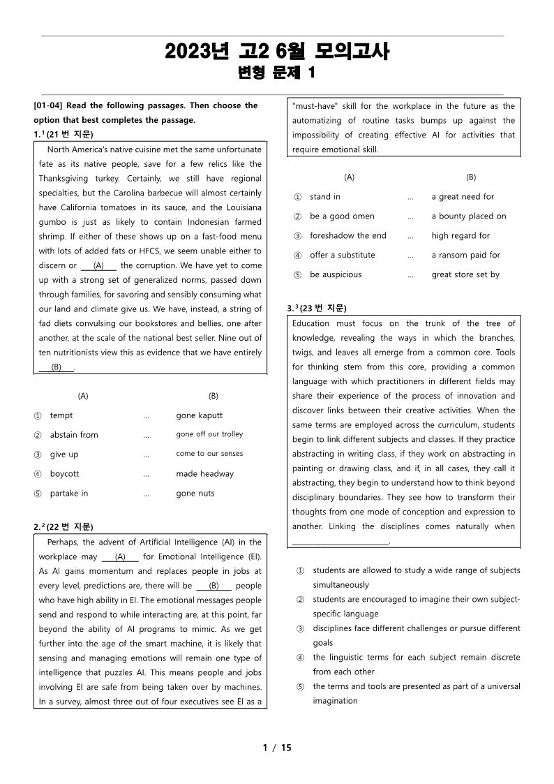 고2 6월 전국 연합 모의고사 변형 문제 1의 지문입니다.
