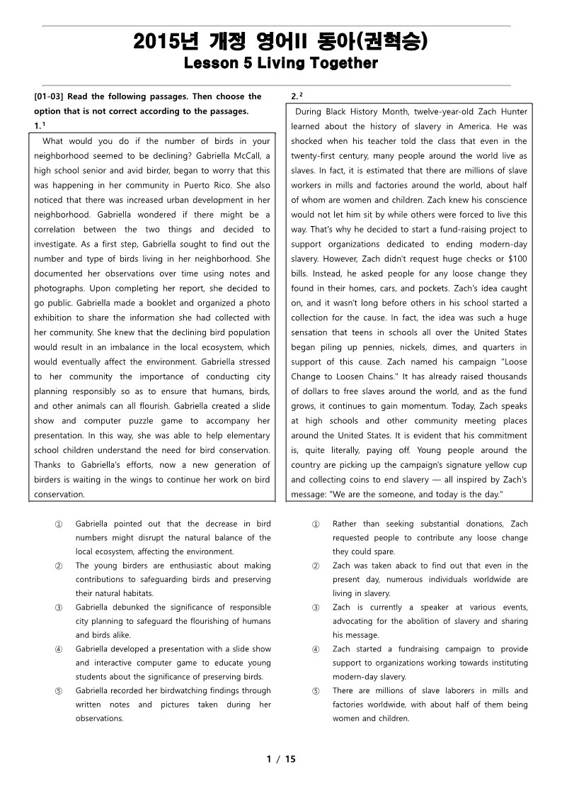 2015년 개정 영어 II 동아(권혁승) 5과 변형 문제 Living Together