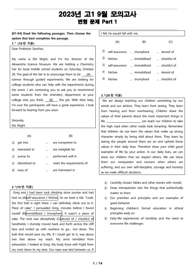 2023년 고1 9월 전국 연합 모의고사 변형 문제 Part 1의 지문입니다.