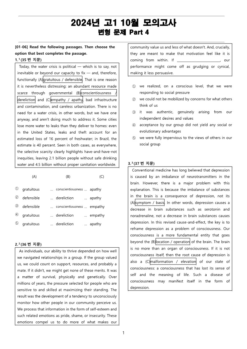 2024년 고1 10월 전국 연합 모의고사 변형 문제 Part 4(PDF)