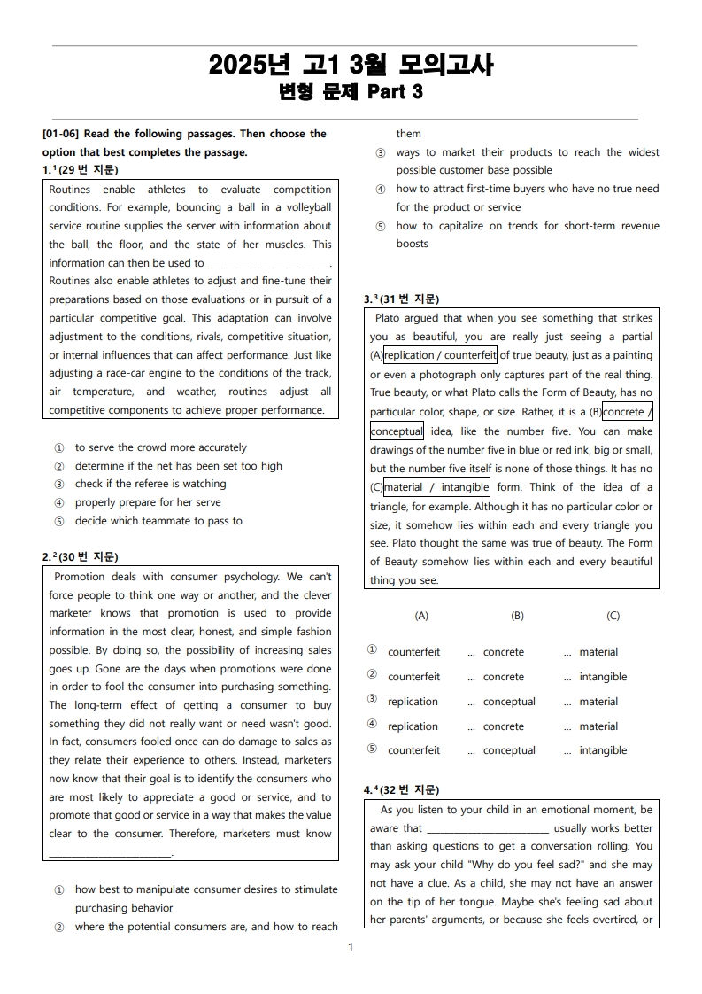 2025년 고1 3월 전국 연합 모의고사 변형 문제 Part 3 (66문항) (PDF)