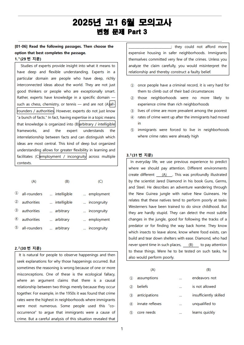 2025년 고1 6월 전국 연합 모의고사 변형 문제 Part 3(PDF)