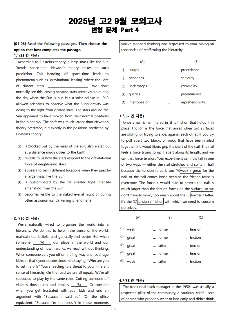 2025년 고2 9월 전국 연합 모의고사 변형 문제 Part 4 PDF
