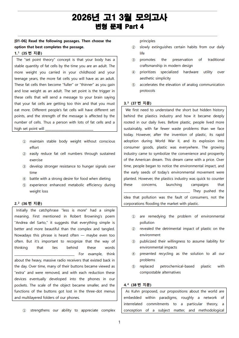 2026년 고1 3월 전국 연합 모의고사 변형 문제 Part 4의 지문입니다.