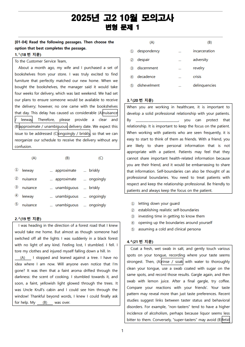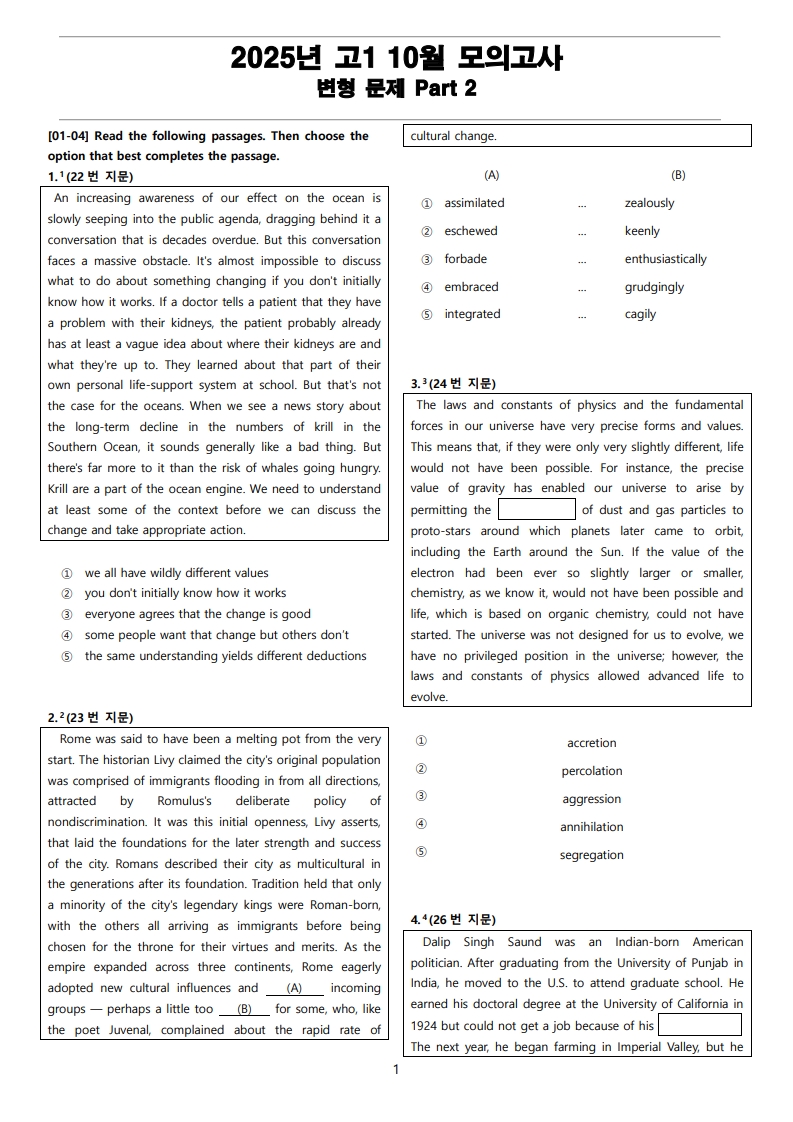 2025년 고2 10월 전국 연합 모의고사 변형 문제 Part 4의 지문입니다.