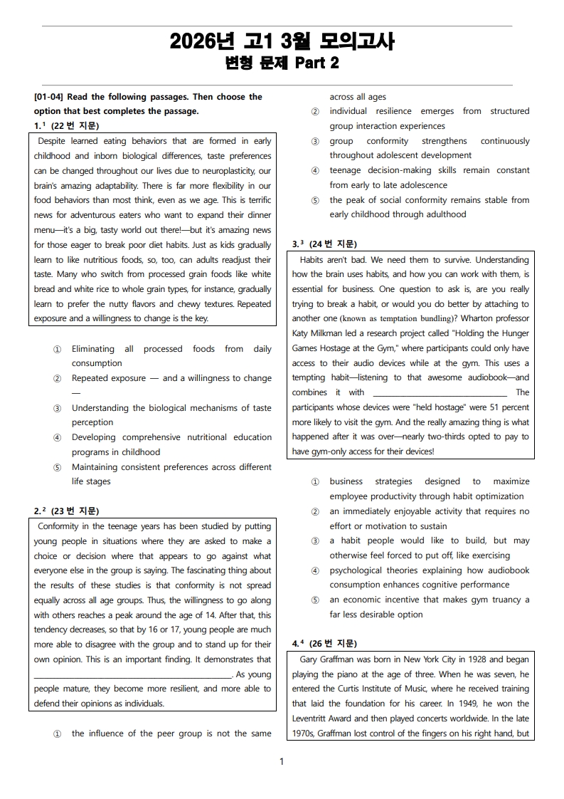 2026년 고1 3월 전국 연합 모의고사 변형 문제 Part 3