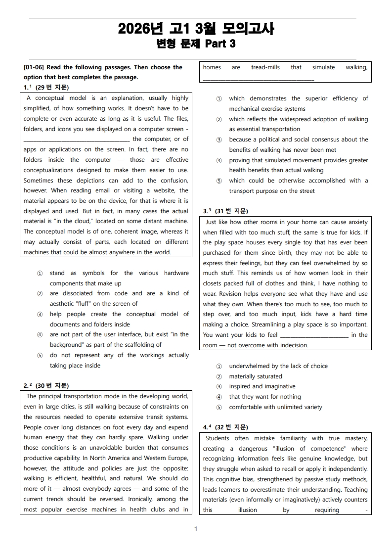 2026년 고1 3월 전국 연합 모의고사 변형 문제 Part 3 (66문항) (PDF)